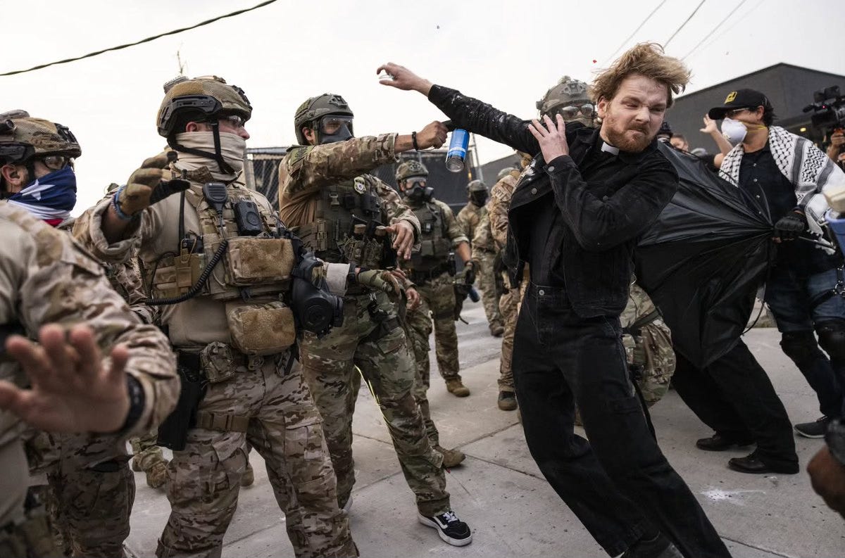 Just the other day, standing in a position of prayer, David Black, pastor of First Presbyterian Church of Chicago, was peacefully protesting outside an ICE processing facility in Broadview, Illinois, when ICE agents shot him in the head, face, torso, arms, and legs with exploding pepper pellets.